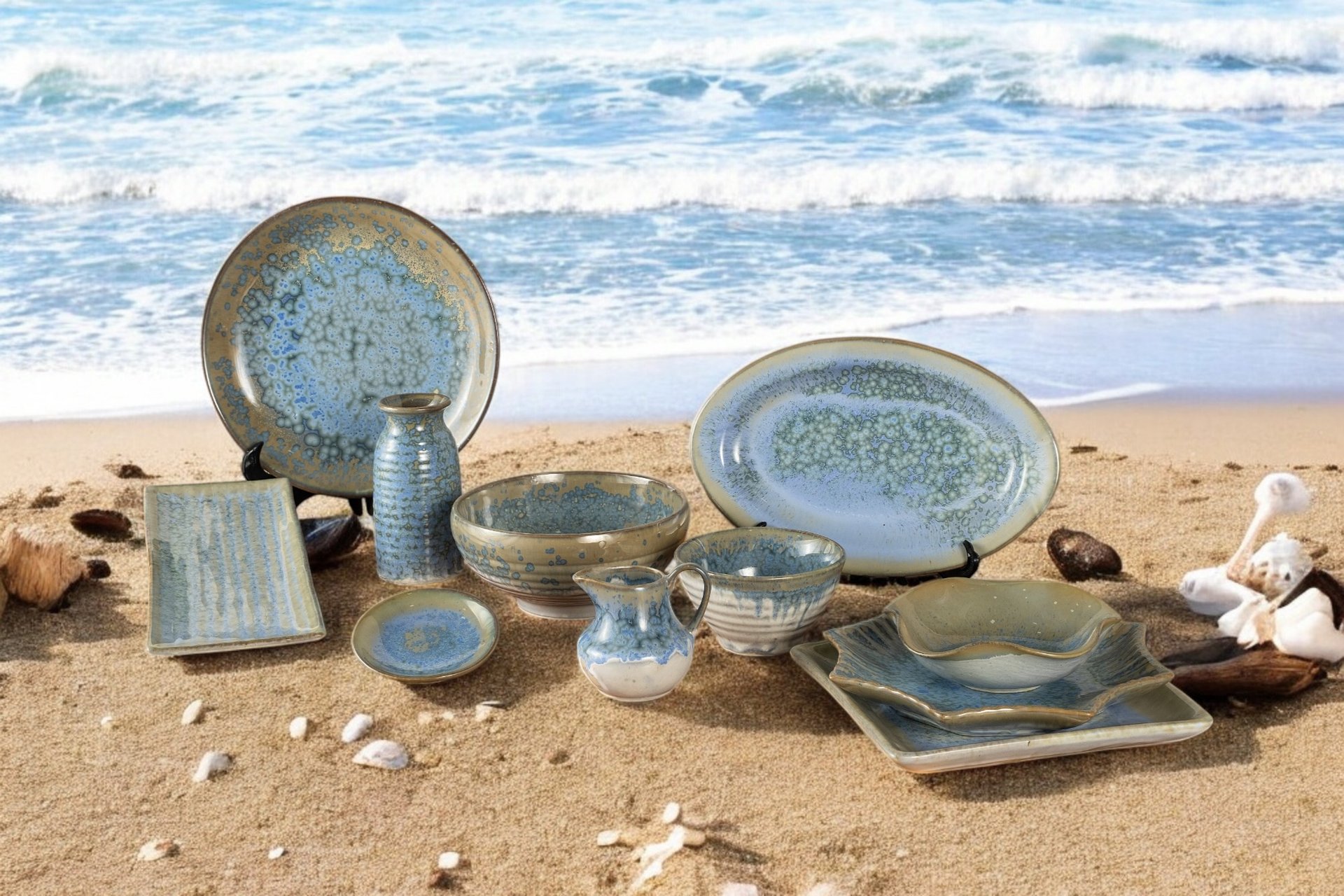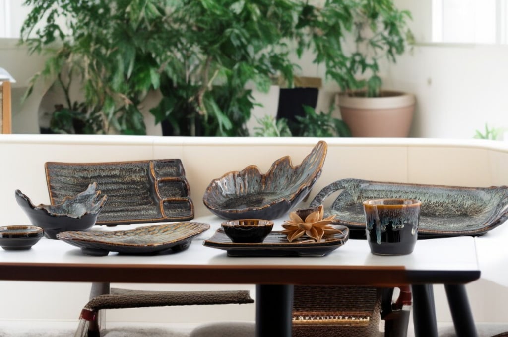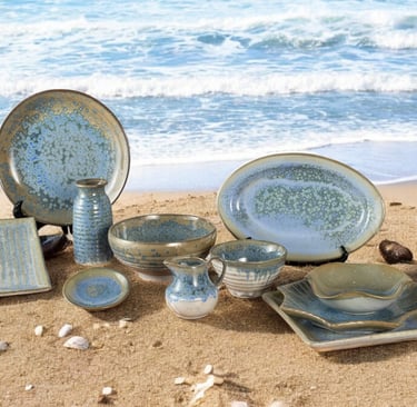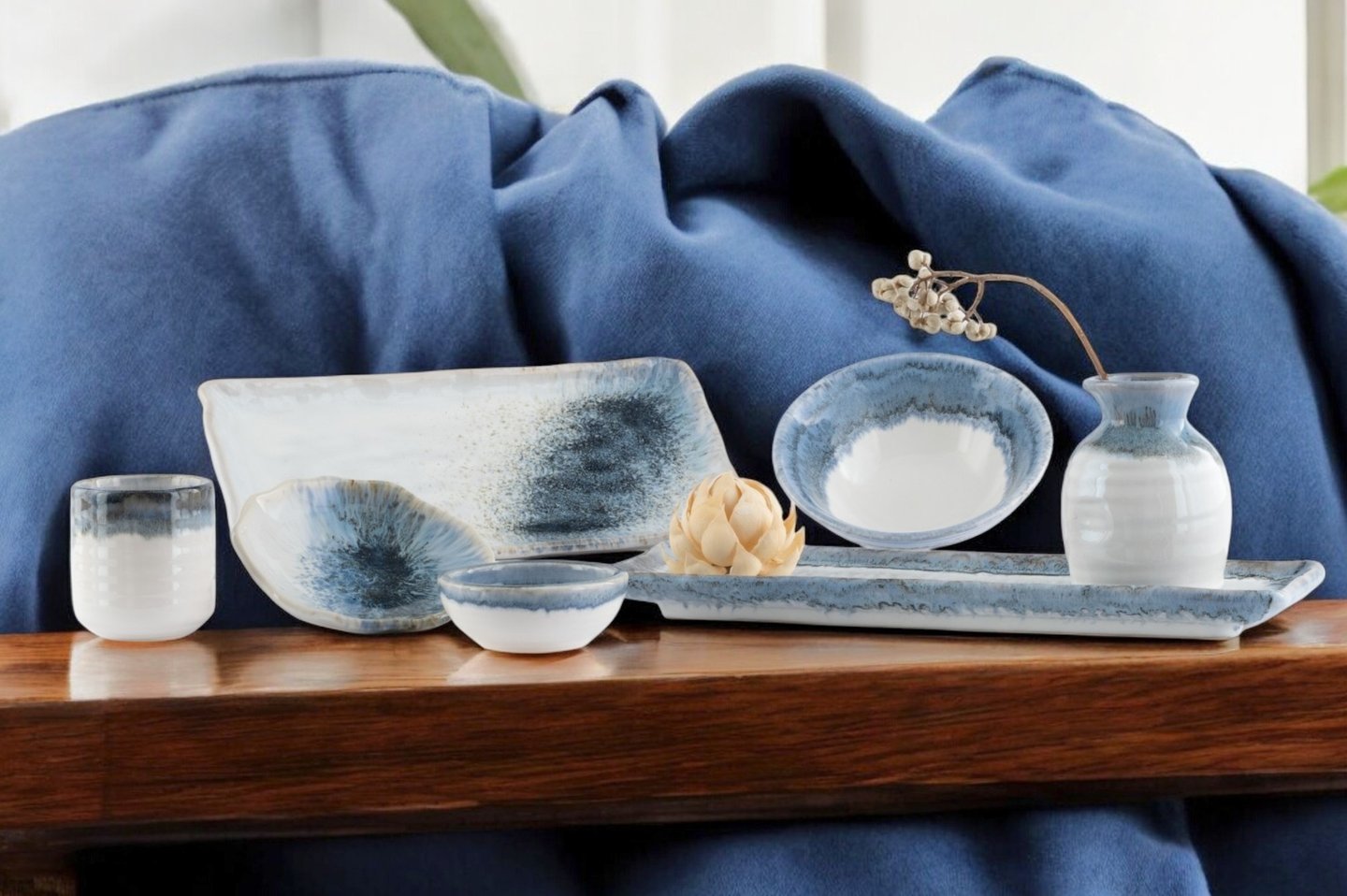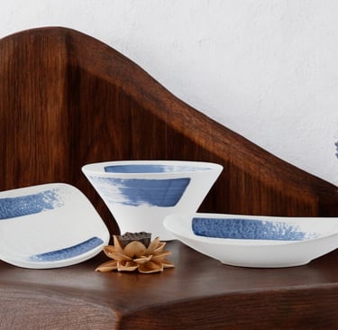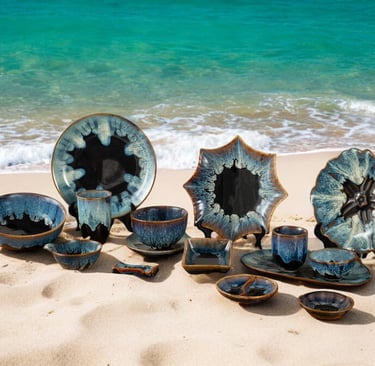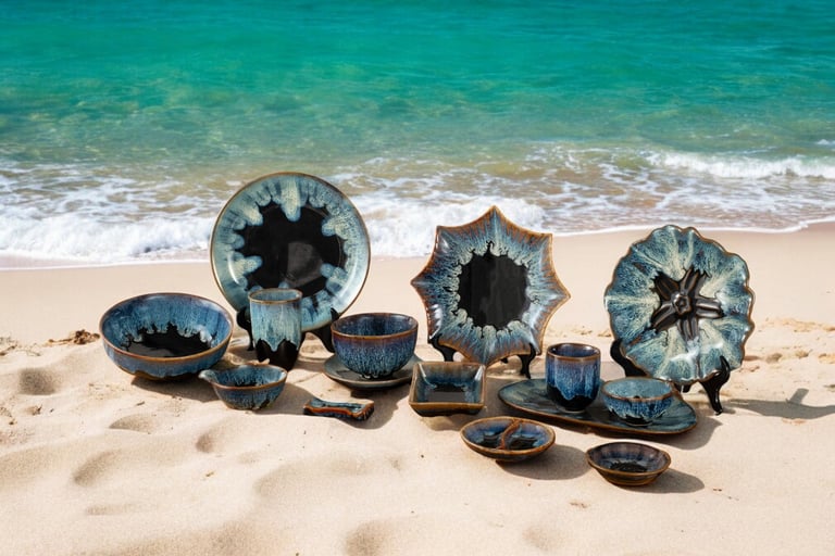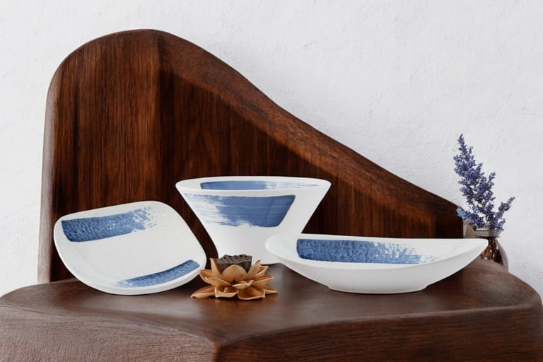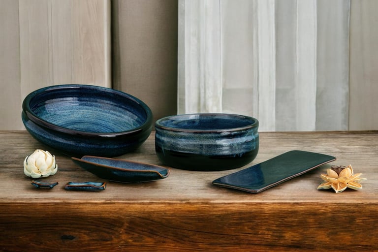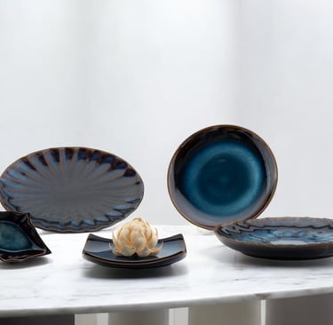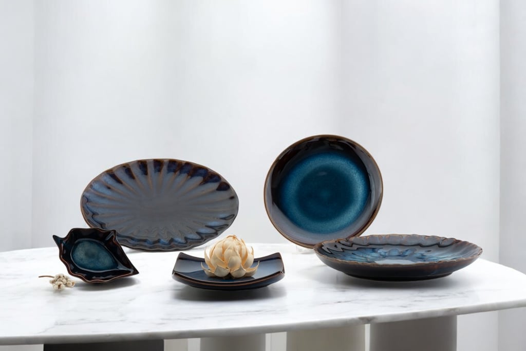 A captivating collection featuring deep blue hues and organic shapes, blending artistry and functionality to elevate both casual and fine dining experiences