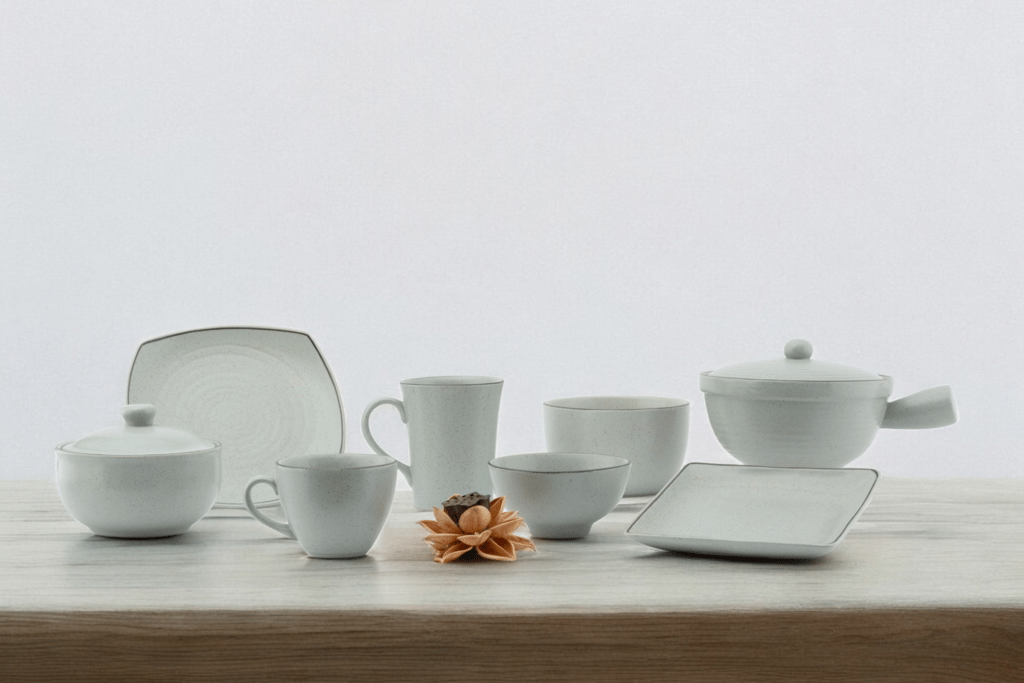 Neutral whites with soft speckles offer a quiet, timeless base that enhances clean plating and ingredient-driven presentation styles