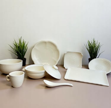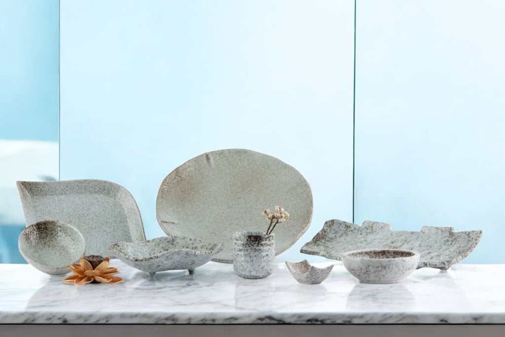 A refined ivory-toned collection with organic forms, subtle textures, and delicate yellow speckles that add character and uniqueness