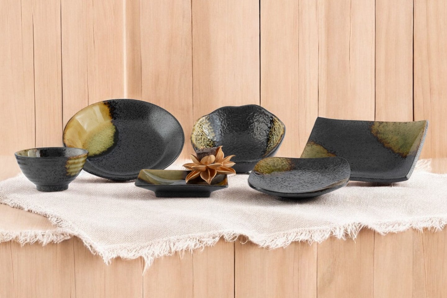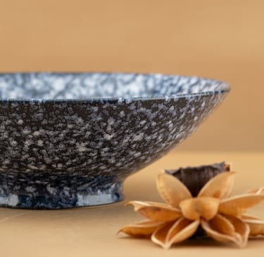 Masterfully crafted, speckled glaze, organic shapes ideal for enhancing elegant dining and artistic culinary presentation in upscale dining environments