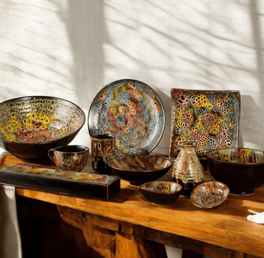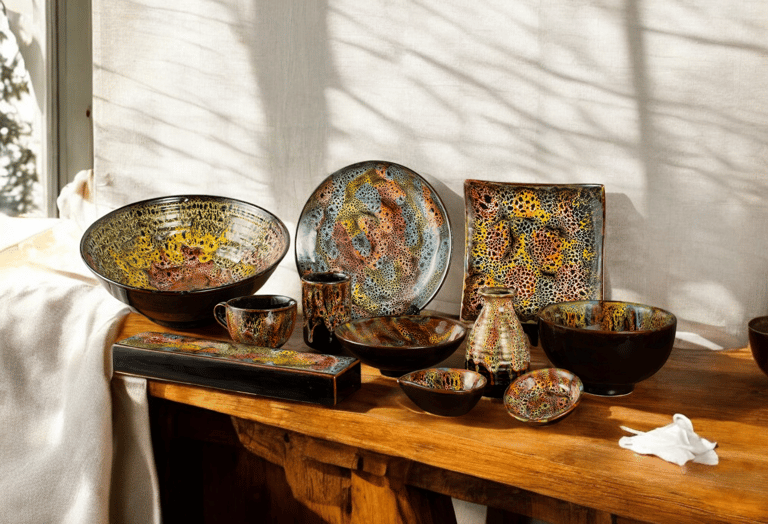 With swirling earthy tones and textured surfaces, this collection evokes the power of nature, creating a bold, grounded dining experience