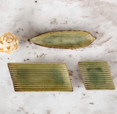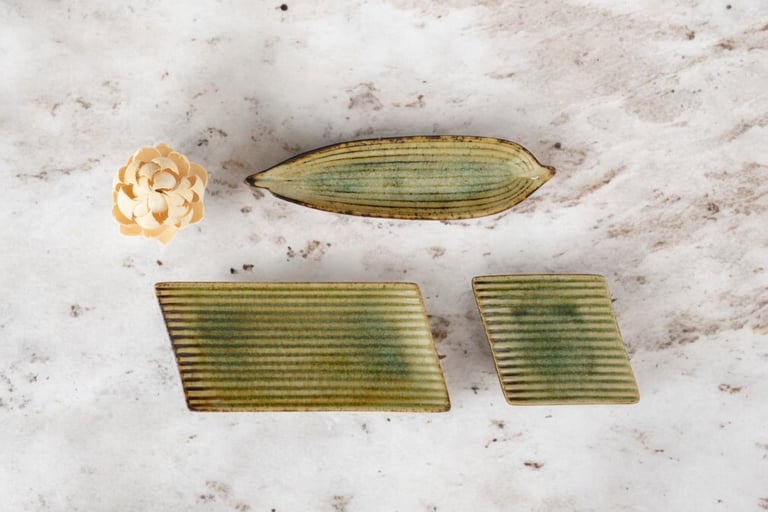 Grooved textures in muted greens and yellow ochre offer a quiet, tactile backdrop for simple, ingredient-focused presentations
