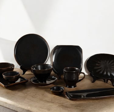 Crafted in deep, matte black with sleek, minimalist shapes, this collection brings a modern, dramatic elegance to any table