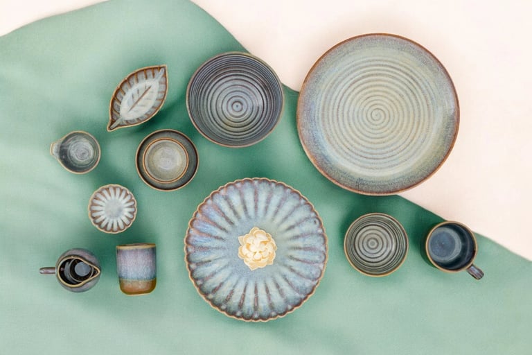 Artisan-crafted with gradated earthen blues, textured spirals, and rustic finesse, suited for contemporary Asian and Mediterranean dining experiences