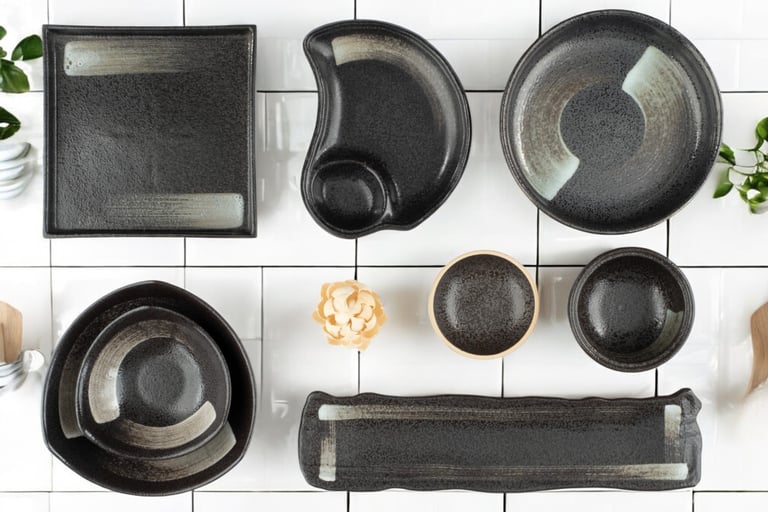 Matte black finish and clean grid lines bring a bold, structured style to modern Asian and tasting-format presentations