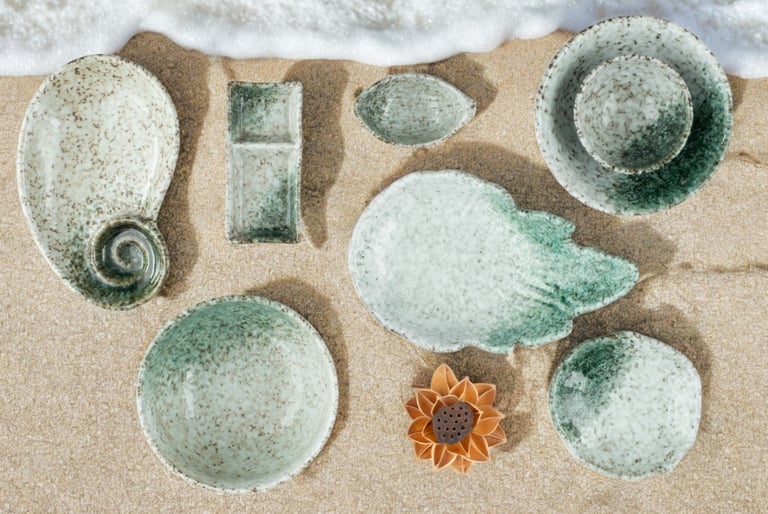 Soft greens and speckled whites reflect coastal calm, offering a fresh, organic look ideal for seafood and nature-driven menus