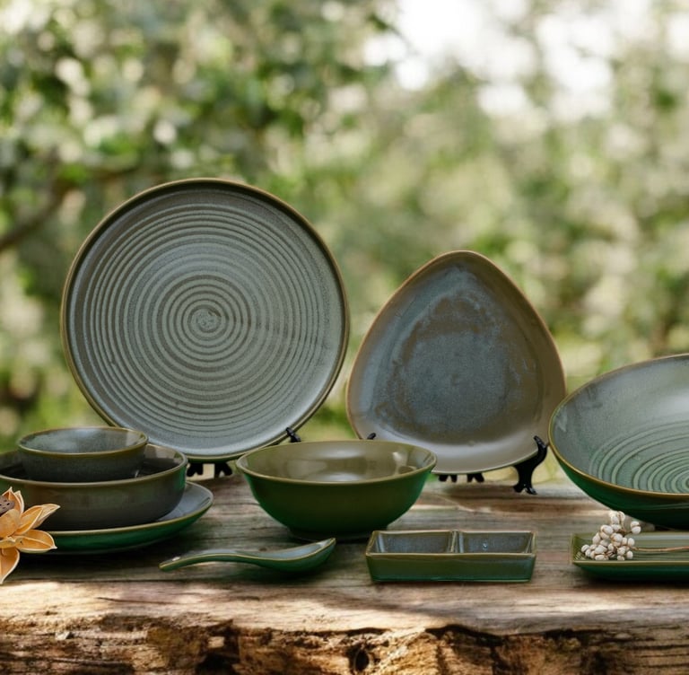 With swirling earthy tones and textured surfaces, this collection evokes the power of nature, creating a bold, grounded dining experience